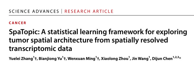 2024 年 9 月 27 日,太阳成集团tyc33455cc陈迪俊课题组在《Science Advances》杂志发表了题为 “SpaTopic: A statistical learning framework for exploring tumor spatial architecture from spatially resolved transcriptomic data” 的研究论文。该研究开发了一种名为 SpaTopic 的统计学习框架,通过主题建模(topic modeling)将空间转录组数据的聚类和反卷积分析有机结合,能够将肿瘤微环境划分为具有一致细胞组成的空间域,从而实现对其精细的功能注释。SpaTopic能够精准识别多种与肿瘤功能相关的空间域,包括三级淋巴结构和肿瘤边界等。更为重要的是,SpaTopic 推断出的空间域标记基因稳定性强,具有良好的迁移能力,能够用于预测新数据集中的空间域。此外,SpaTopic 还支持跨数据集的空间域定量比较和功能分析,为肿瘤微环境的功能解析提供了强大的工具和全新视角,其推断出的空间域标记物具有广泛的应用潜力。