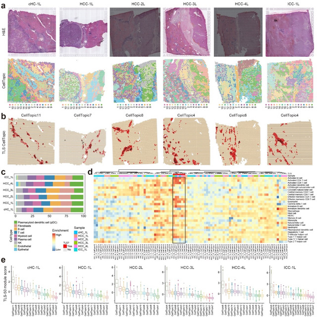 三级淋巴结构是非淋巴组织中因慢性炎症形成的独特免疫微环境,包含B细胞、T细胞、树突状细胞(DCs)等多种免疫细胞。TLSs的细胞组成因组织和炎症条件的不同而存在变异,给计算预测带来挑战。通过对原发性肝癌的空间转录组数据进行分析,SpaTopic识别出与TLSs相关的空间域,这些空间域与B细胞、T细胞和树突状细胞等免疫细胞紧密共定位,形成了典型的TLSs结构。此外,SpaTopic不仅为TLSs的识别提供了一种无偏的方法,其衍生的标记基因集TLS-25在不同癌症类型中显示出一致的表达模式,能够有效预测TLS的存在,并与患者的生存率相关联。
