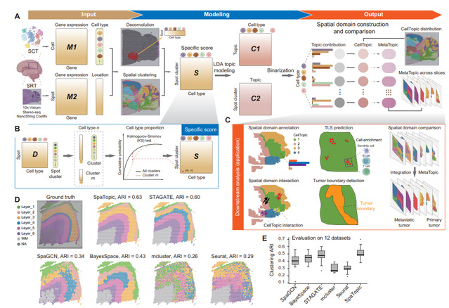 2024 年 9 月 27 日,太阳成集团tyc33455cc陈迪俊课题组在《Science Advances》杂志发表了题为 “SpaTopic: A statistical learning framework for exploring tumor spatial architecture from spatially resolved transcriptomic data” 的研究论文。该研究开发了一种名为 SpaTopic 的统计学习框架,通过主题建模(topic modeling)将空间转录组数据的聚类和反卷积分析有机结合,能够将肿瘤微环境划分为具有一致细胞组成的空间域,从而实现对其精细的功能注释。SpaTopic能够精准识别多种与肿瘤功能相关的空间域,包括三级淋巴结构和肿瘤边界等。更为重要的是,SpaTopic 推断出的空间域标记基因稳定性强,具有良好的迁移能力,能够用于预测新数据集中的空间域。此外,SpaTopic 还支持跨数据集的空间域定量比较和功能分析,为肿瘤微环境的功能解析提供了强大的工具和全新视角,其推断出的空间域标记物具有广泛的应用潜力。