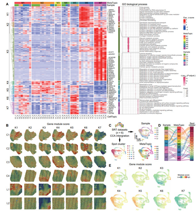 然后,通过深入分析不同 MetaTopics 间的基因表达模式,得到 907 个基因在各MetaTopics中表现出显著差异,并将它们划分为七个不同的基因模块(K1 到 K7)。例如:基因模块 K3 在转移特异性 MetaTopic M7 中显著高表达,包含脂肪酸代谢和急性炎症反应等生物过程,标志着肿瘤转移的特征。模块 K4 和 K5 在原发肿瘤相关 MetaTopics中活跃,涉及能量生产和代谢调控等功能。模块 K7 在原发和转移相关的MetaTopics间共享,富含免疫相关通路。通过整合六个空间转录组数据集,MetaTopics在相似的基因表达模式的特定点聚类中明确映射,进一步验证了SpaTopic在空间域定量比较和功能注释中的有效性。