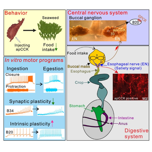 行为学与离体环路实验表明,海兔CCK与哺乳动物CCK一样,均属于“饱肽”(satiety peptide)。海兔CCK可显著减少摄食量,并在离体运动程序中再现“进食→拒斥→停止”的顺序变化,模式与哺乳动物一致。此外,海兔肠道CCK细胞经肠神经投射至中枢,刺激肠神经可诱发中枢CCK释放。动机转换的神经环路与突触机制