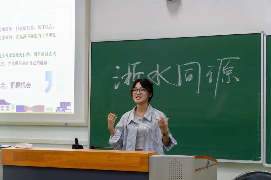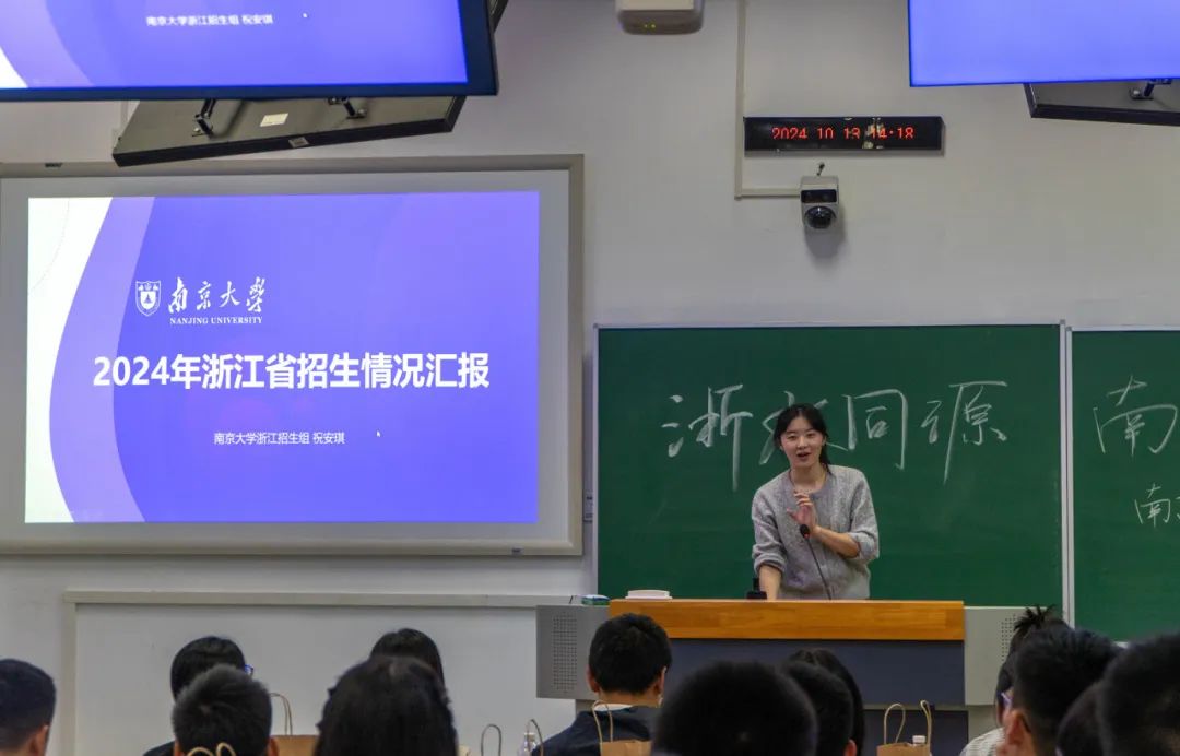 接着,浙江招生组副组长祝安琪老师结合具体数据详细介绍了2024级浙江地区的录取情况和员工发展状况——恰一百名新生分布在七大书院,将会共同书写南浙人的辉煌新篇章。这些数据让同学们更加清楚地了解了自己所处的位置和未来的发展方向,也让同学们为自己能够成为南大的一员而感到自豪。