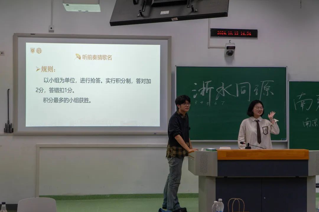为了让同学们更好地相互认识和了解,一系列有趣的破冰游戏有序展开。名字串串烧让同学们快速记住了彼此的名字、知晓了各自的性格;听前奏猜歌名和看台词猜电影/书则考验了同学们的音乐知识、电影容量和阅读面,同时也让现场的气氛变得更加热烈。