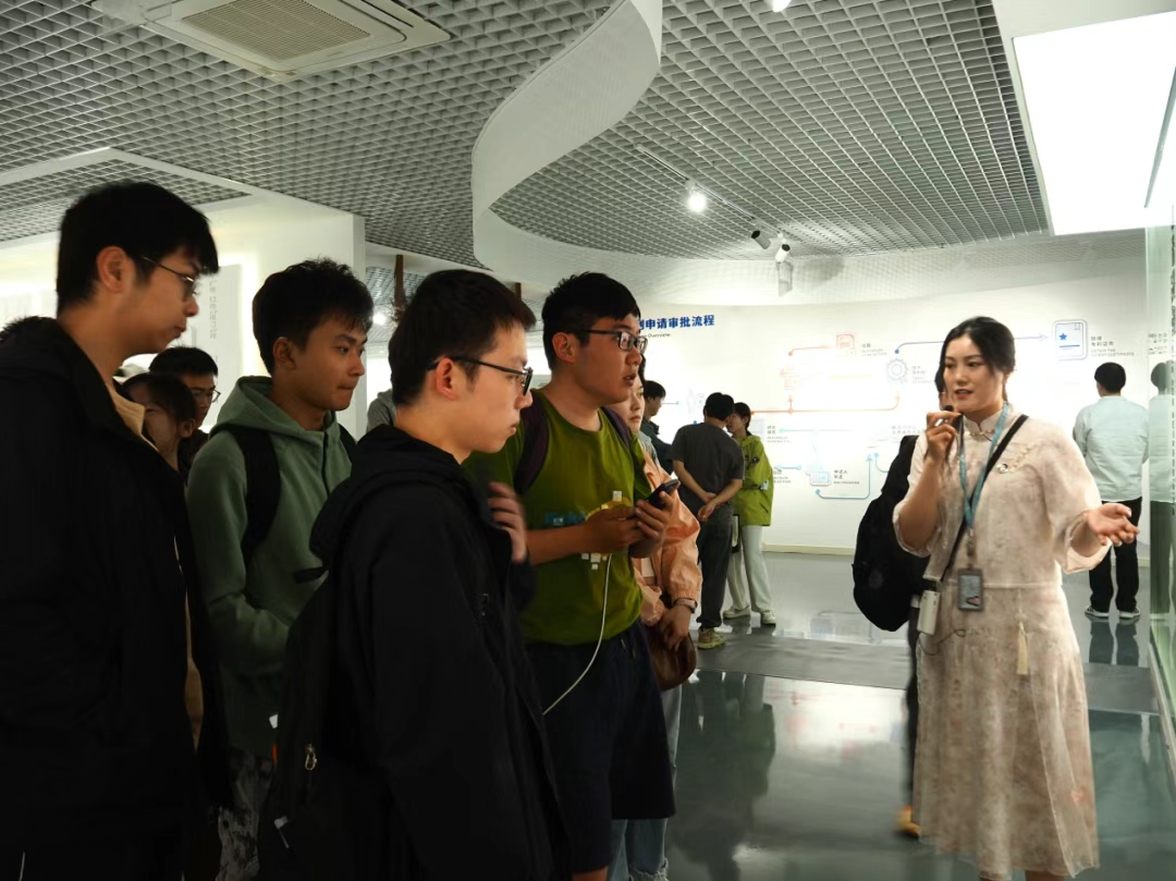 在审协江苏中心工作人员的引导下,师生一行首先参观了中心展厅。展厅内容丰富、形式多样,系统梳理了我国专利制度的发展历程,展示了专利法实施以来的重要历史节点与制度改革进程。讲解员结合具体案例,生动讲述了中国专利事业从无到有、从弱到强的发展轨迹。特别是在高端制造、生物医药、新材料等重点领域的专利成果展示,让在场师生真切感受到知识产权制度对科技创新的有力推动和保护作用。随后,大家深入审查员办公区域,了解专利实质审查的具体流程与工作机制。