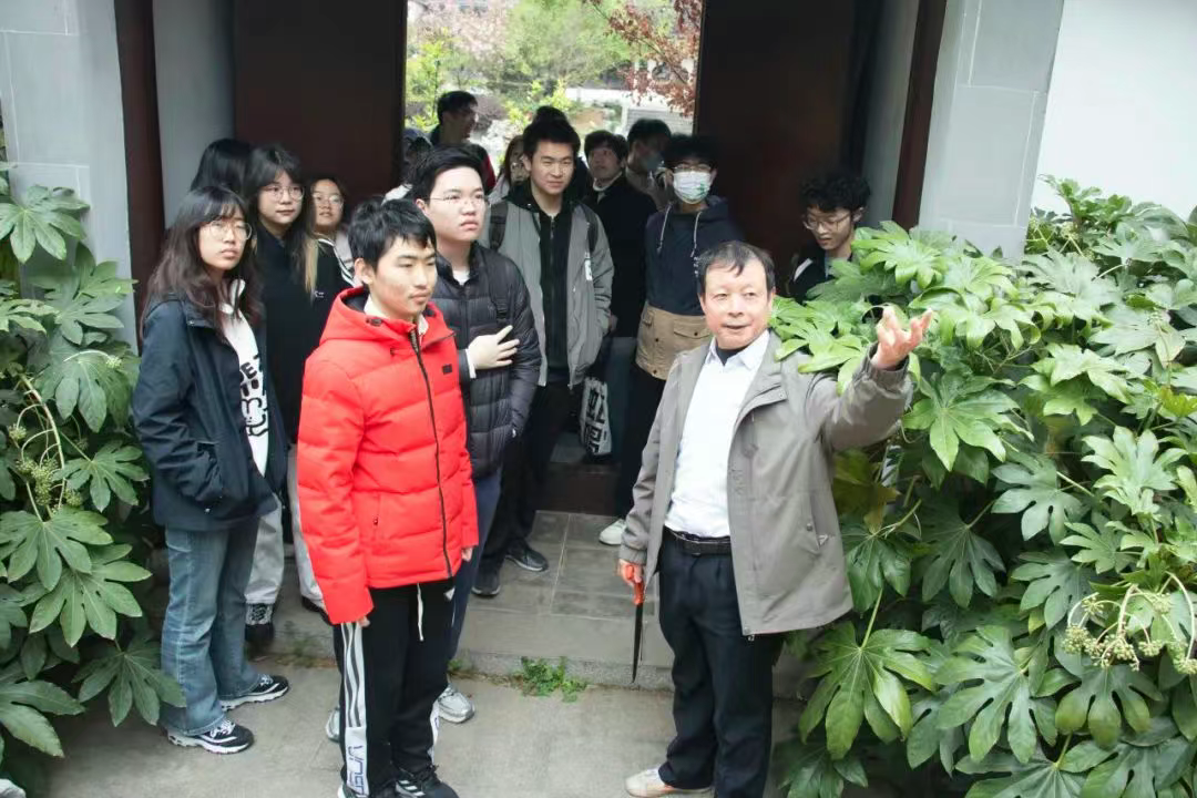 活动伊始,王老师介绍了香雪海背景、历史文化与功能分区后,带领同学们参观梅鹤亭、梅庵、聚贤亭、御梅池、船舫等景观。亭台榭虹廊临水而筑,配湖石假山、石洞石刻、清泉瀑布、梅花植物,构成宛若仙境的写意山水画。“香舟”景点描写的“画桨每侵疏影瘦,芳樽浑带冷香还”景色,给大家留下深刻印象。王老师重点介绍了园林造景、植物配置、植物形态特点,以及“岁寒三友”经典搭配。他还指导同学们认识了朱砂、宫粉、玉蝶、绿萼、跳枝、美人梅、杏梅等梅花品种,以及物候特点与开花习性。通过现场对比和形态学观察,同学们认识了结香、红花檵木、桂花、黑松、箬竹、凤尾竹、女贞、八角金盘等花卉植物,理论联系实际,加深了大家对课堂上植物学理论的理解。