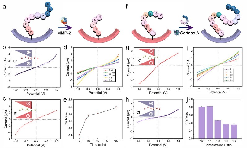 Prof. Genxi Li and his research group have long been engaged in research on biomolecular engineering and applications in disease diagnosis. Therefore, using the detection of the tumor marker matrix metalloproteinase-2 (MMP-2) as an example, the group has designed a substrate peptide containing the cleavage site of MMP-2 on the nanochannels (Figure 2). The substrate peptide has a higher isoelectric point than the physiological pH, resulting in a positive charge on the surface of the nanochannel. However, under the catalysis of MMP-2, the substrate peptide is cleaved between the Gly and Val in the peptide, resulting in the loss of positively charged amino acids and a change in the isoelectric point of the remaining peptide on the channel surface. Therefore, under physiological conditions, peptide cleavage can change the polarity of the surface charge of the nanochannels from positive to negative, which can be visually reflected in the I-V curve.