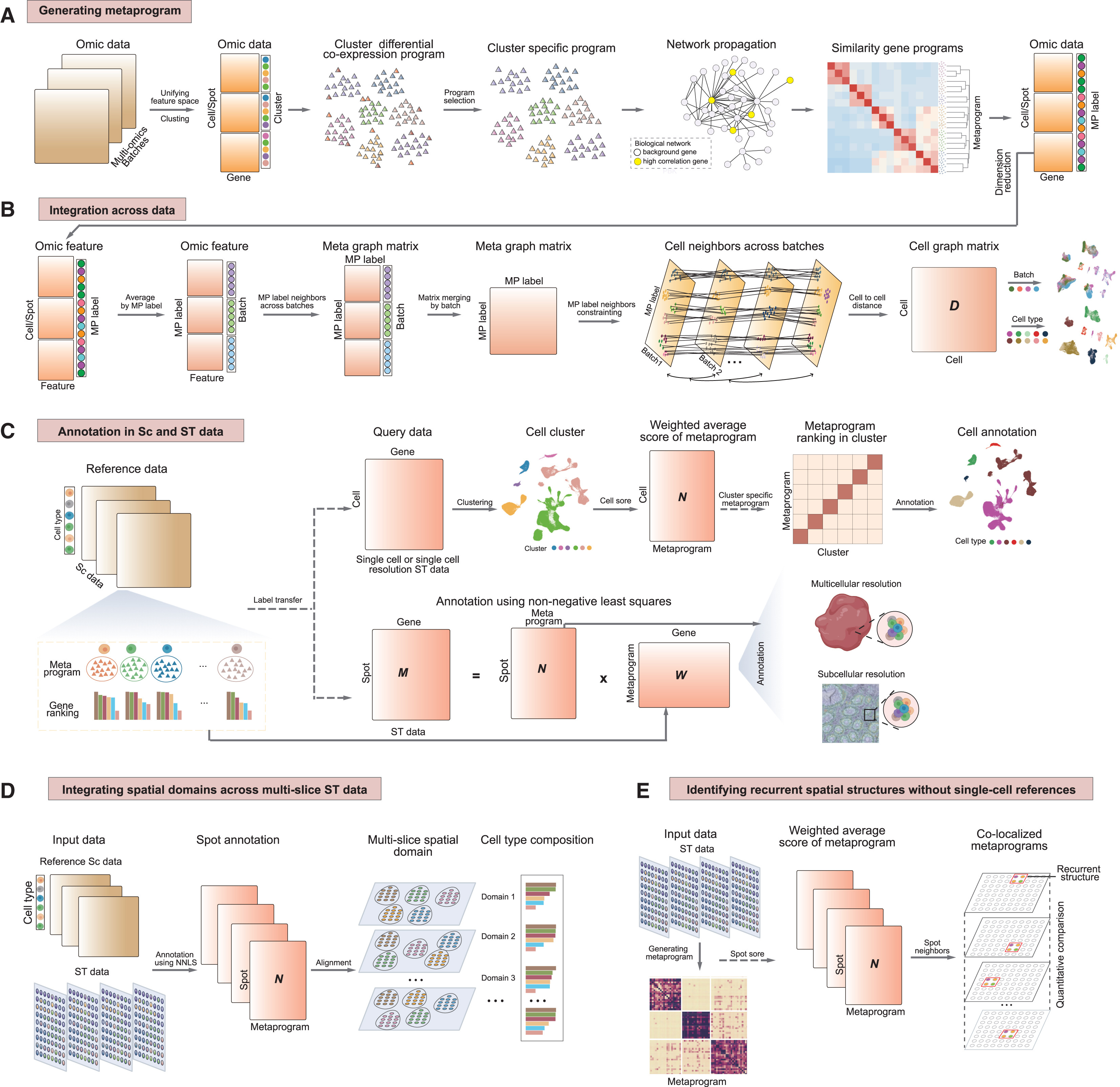 Figure 1. Schematic overview of SSpMosaic. (A) Construction of metaprograms across single-cell and spatial omics datasets. (B) Workflow of data integration through the anchors of metaprograms. (C) Cell/spatial annotation using reference metaprograms in (A). (D) Cross-slice spatial transcriptomics analysis. (E) Reference-free spatial characterization.