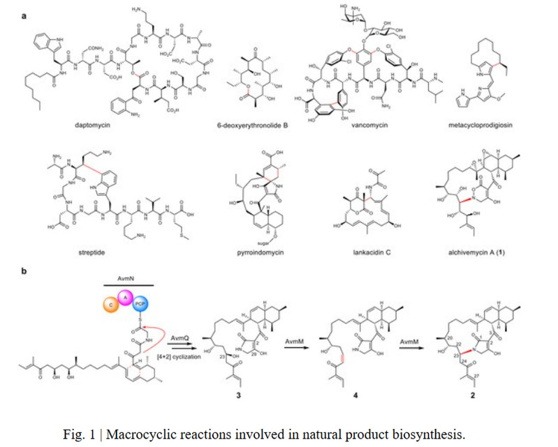 Alchivemycin A (AVM, 1) is a highly oxidized antimicrobial polyketide compound isolated from the endophytic plant Streptomyces sp. TP-A0867. It has a complex structure with a 17-membered N-heterocycle, a decalin ring, a rare 2H-tetrahydro-4,6-dioxo-1,2-diazine ring (TDO), an epoxy ring, and 16 chiral centers. In previous studies, Professor Guo Huiming's team from the School of Life Sciences at Nanjing University elucidated the secondary metabolism network involving six oxidoreductases during AVM biosynthesis, including unique intermolecular oxygen insertion into an amide bond (J. Am. Chem. Soc. 2021, 143, 4751−4757), but the process of its macrocyclization remained unknown. Recently, the team continued to analyze this macrocyclization process.
