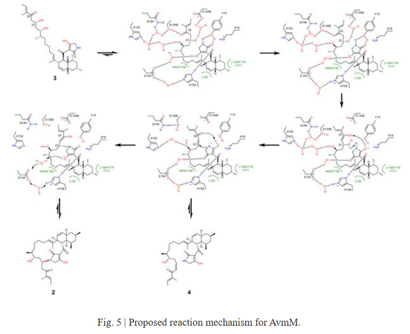 Subsequently, combined with crystal structures, molecular docking and molecular dynamics simulations, point mutations were performed to verify the active site of the protein. Meanwhile, trace amounts of an unstable, speculated dehydrated intermediate were detected in the catalysis of AvmM-L182A, and eventually identified as dehydrated compound 4.