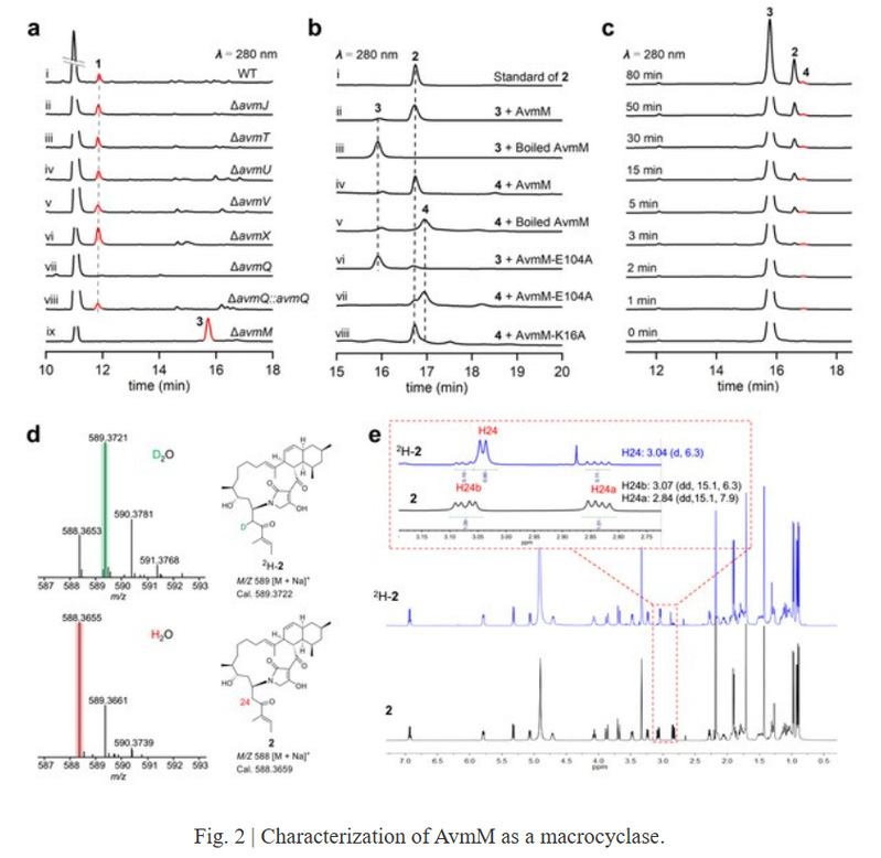 To elucidate its cyclization mechanism, the authors first knocked out the remaining uncharacterized genes in the gene cluster and found that avmM was associated with the formation of the 16-membered macrolactone in compound 2. Further in vitro enzyme catalysis showed that AvmM can rapidly cyclize compound 3 to form 2 without requiring any cofactors. The cyclization of compound 3 to 2 involves the departure of the hydroxyl group and the formation of a C-N bond, but the reaction result is inconsistent with an SN reaction. Deuterium labeling experiments found that the α-H of the carbonyl group at C25 was labeled with a D, indicating that β-elimination to form a double bond occurred first in the reaction, followed by a Michael addition to cyclize the molecule, although an intermediate dehydrated double bond was not captured in the reaction time course.
