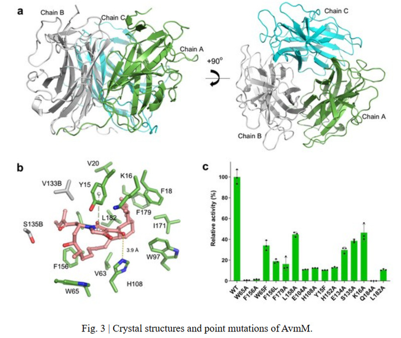 Subsequent bioinformatics analysis revealed that no protein similar to AvmM was found in the database, whether at the primary sequence or tertiary structure level. To further understand the catalytic process of AvmM, the phase was determined by introducing selenomethionine into the protein, and the crystal structures of AvmM (2.09 Å) and AvmM-2 (2.5 Å) complex were finally obtained. It was found that AvmM exists in the form of a homotrimer composed almost exclusively of beta folds.