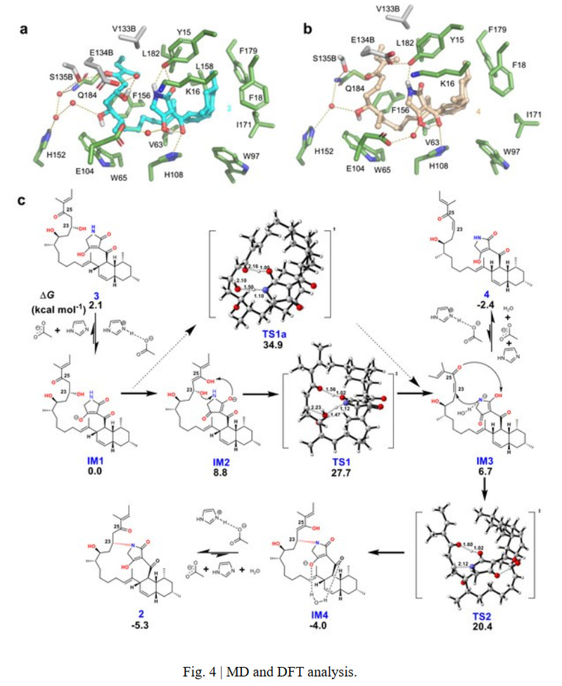 Unlike the classical PKS dehydration step that requires histidine to extract the α-H of the carbonyl group and provide a proton for the dehydration of β-OH, no amino acid residue within a 5 Å range of substrate 3 could act as a base to remove the α-H (H-24) of 3. To reveal its unique reaction mechanism, DFT calculations were further carried out. Based on all the above results, the catalytic mechanism of AvmM was analyzed: key residues E104 and H108 could initiate the dehydration reaction by proton transfer through the tetramer part, followed by N attack on β-C (C-23) for Michael addition, and the protonation of the enol intermediate resulted in the formation of cyclic product 2. At the same time, the formation of the 16-membered ring can significantly change the conformation of the flexible side chain in substrate 3, leading to the disappearance of hydrogen bonding interactions between the side chain and protein residues, facilitating the release of product 2 to complete the catalytic cycle.
