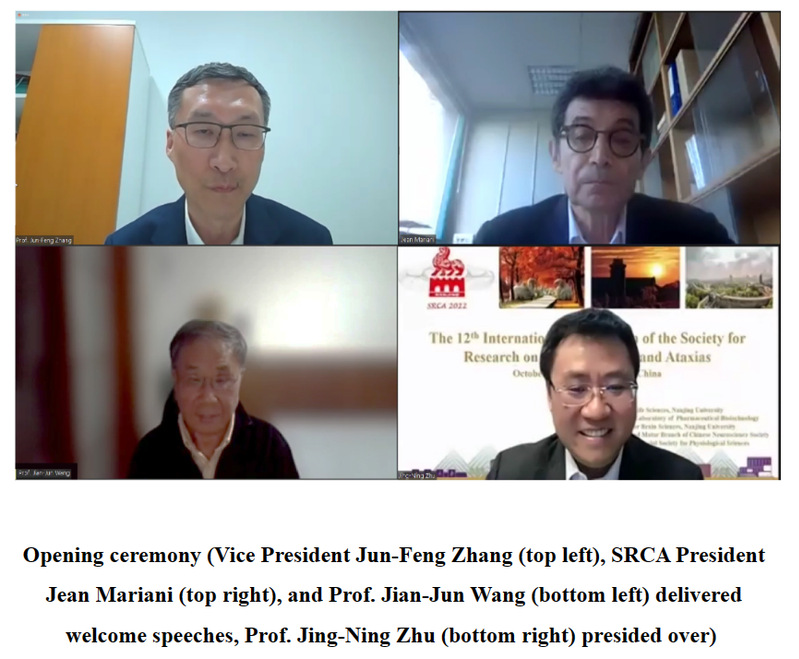 On October 21-22 of 2022, the 12th International Symposium of the Society for Research on the Cerebellum and Ataxias (SRCA), hosted by Nanjing University, was successfully held. The symposium was planned to be held in person and were changed to online in response to the pandemic. Prof. Jun-Feng Zhang, vice president of Nanjing University, and Prof. Jean Mariani of Sorbonne University, president of the SRCA, as well as nearly 300 investigators, clinicians, and graduate students from China, the United States, the Netherlands, the United Kingdom, Germany, Portugal, Japan, and South Korea, attended the 12th International Symposium. The symposium was co-organized by School of Life Sciences, the State Key Laboratory of Pharmaceutical Biotechnology, the Institute of Brain Sciences of Nanjing University, the Sensory and Motor Branch of the Chinese Neuroscience Society, and the Jiangsu Society of Physiological Sciences. Prof. Jing-Ning Zhu, vice dean of School of Life Sciences of Nanjing University, served as the chair of the symposium, Prof. Ying Shen from School of Medicine of Zhejiang University served as the co-chair, and Prof. Jian-Jun Wang from School of Life Sciences of Nanjing University served as the honorary president.