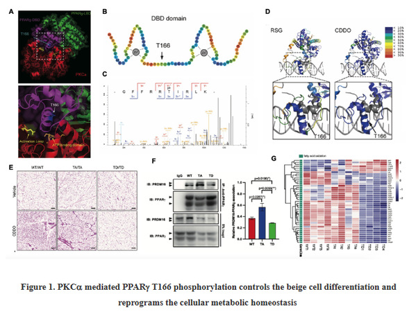 Recently, with the collaboration of Prof. Xiaokun Li (Academician of Chinese Academy of Engineering) in Wenzhou medical university, Shen's group has made an important breakthrough in PPAR biology—Discovering an uncharacterized post-translational modification pattern (T166 phosphorylation) in PPAR DNA binding domain (DBD), and uncovering its entangled function in switching beige cell differentiation (Figure 1). Further molecular mechanism investigation proves that T166 is located between two zinc finger structures in DBD. When the T166 is phosphorylated by PKC, the fine-tuning of DBD conformation changes the allosteric communication between the LBD and DBD, influences the binding affinity of transcriptional coactivators to PPAR ligand binding domain (LBD), which further regulates the PPAR[符号]-mediated transactivation of beige cell-related gene expression in white adipose tissue (WAT) and thus impacts on beige cell differentiation. Based on the important role of PPAR T166 phosphorylation in beige cell metabolic reprogramming, the research group designs the associated genetic/chemical intervention strategies targeting PKC-PPAR axis for highly inducing beige cell biogenesis in WAT, and improving the metabolic dysfunctions. This study not only provides an advanced molecular insight into the basic biological function of PPAR in adipose biology, but also offers a novel therapeutic avenue for the treatment of metabolic diseases.