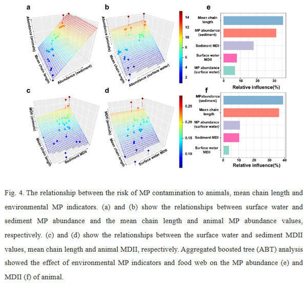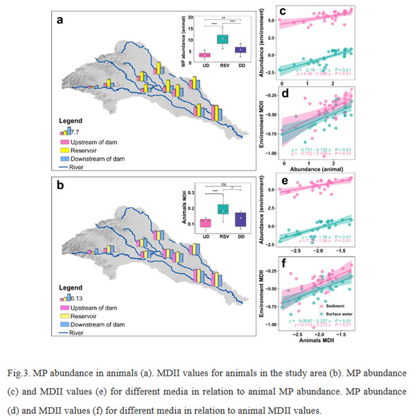 To explore the spatial distribution of MPs in animals under the influence of dams and the factors affecting them, the team explored fish, aquatic arthropods and molluscs in the study area and constructed food webs. The structure of the food web was found to be simplified in the reservoir compared to upstream and downstream of the dam, and animals were found to be at highest risk of contamination by MPs (Fig. 3). The gastrointestinal tract of animals is the organ most rich in MPs accumulation. Molluscs are the most contaminated with MPs and these animals are an important link in the food chain for MPs to enter. The high abundance of MPs in environmental sediments and the simplification of the food web are important factors leading to increased accumulation of MPs in animals (Fig. 4).