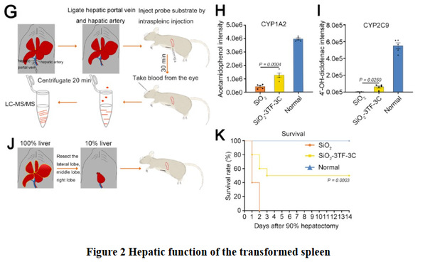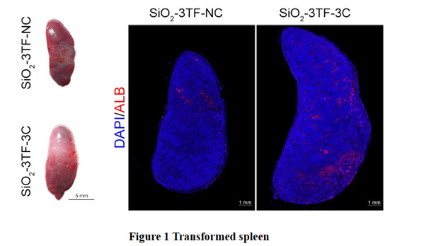 To facilitate continuous injection and observation of the remodeling spleen, the spleen of a mouse was surgically moved from the inner abdomen to a subcutaneous site. Then, silicon oxide (SiO2) nanoparticles were injected into the translocated spleen to promote the proliferation of fibroblasts, laying the foundation for subsequent reprogramming and liver regeneration. Next, the team delivered Foxa3, Gata4 and Hnf1a into SiO2-remodeled spleen by a lentiviral vector to reprogram the splenic activated fibroblasts into a functional hepatocytes (iHeps) in situ. Finally, the spleen was further transported tumor necrosis factor (TNF-α), epidermal growth factor (EGF) and hepatocyte growth factor (HGF) (combination referred to as 3C) to realize the proliferation of iHeps in vivo. And the proportion of iHeps in the reprogrammed spleen reached about 8 × 106. Having had grown for 6 months in the spleen, these iHeps exert